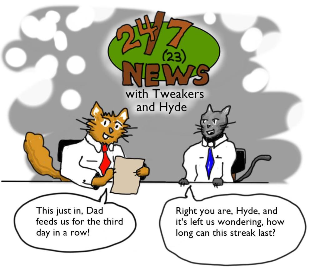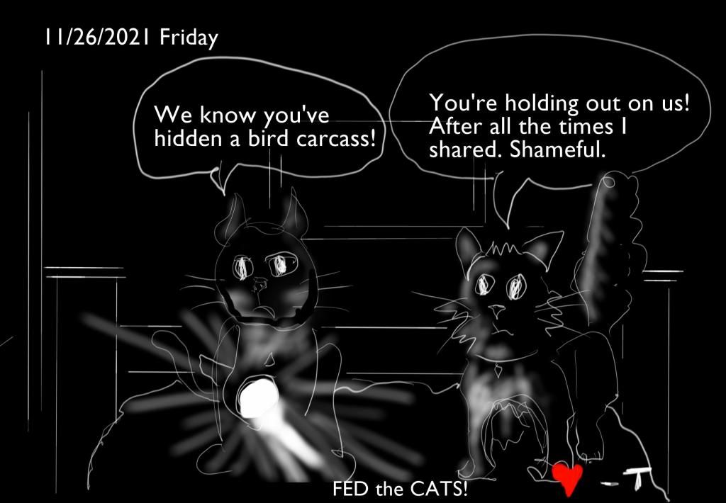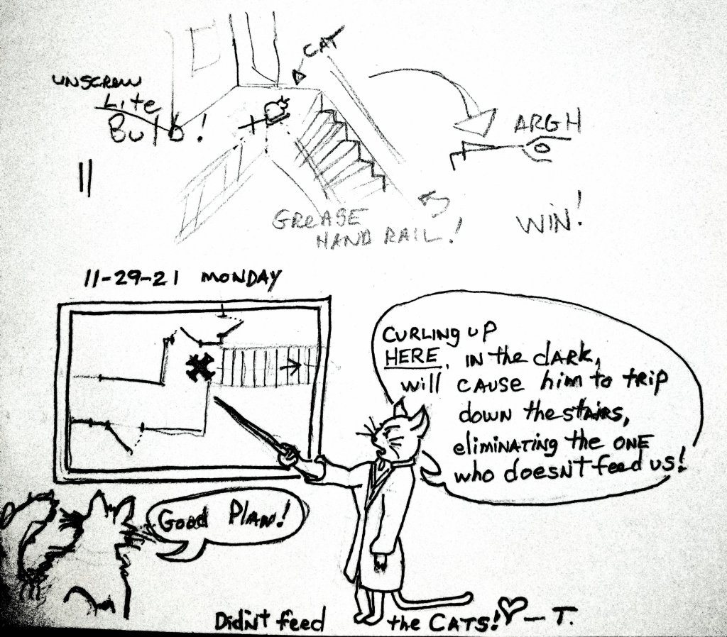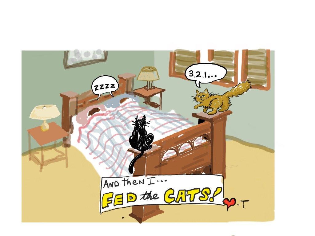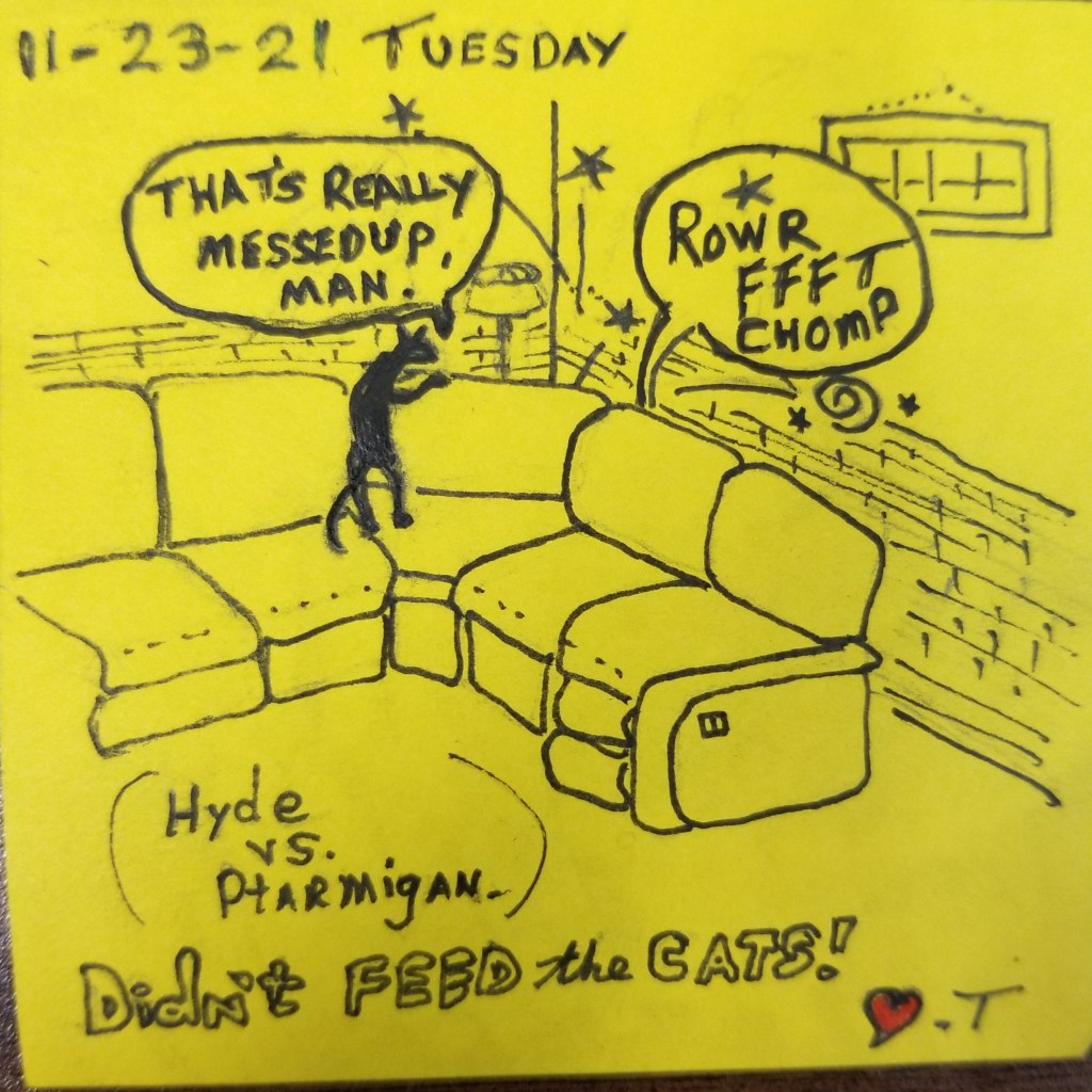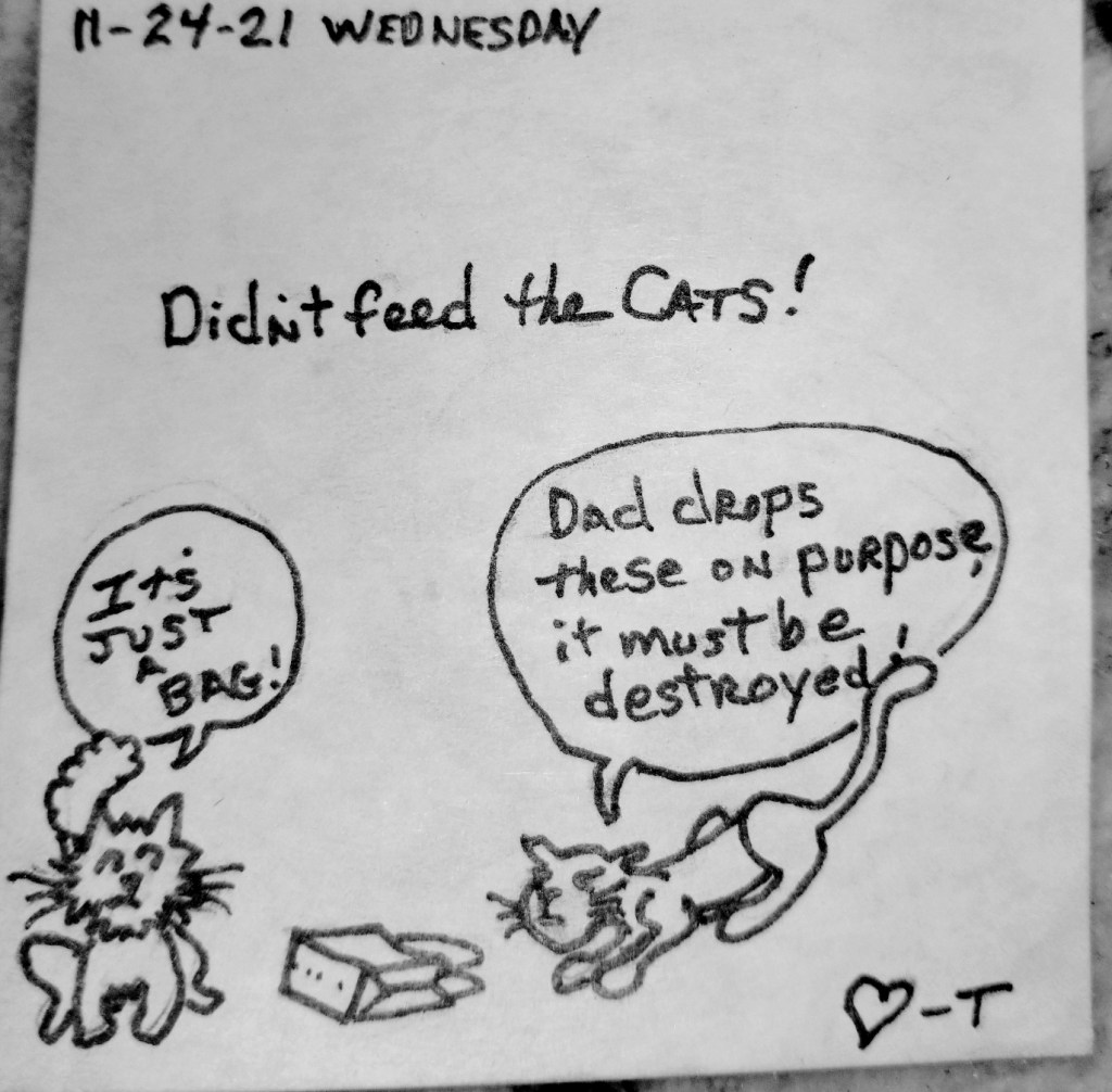 This all started because cats always lie when asked if they’ve been fed or not. A dated note with a wish for a good day, a little “I Love You” added, the did/ didn’t feed line, and out the door. At some point, I added a quick rough cartoon each day, and then that pretty much became the focus, zeroing in on consistent likenesses, fitting a cartoon with text on a Post-It note, trying to make my wife laugh. I’ll be adding some background/ bio info of these furry kids for those who have never actually met them when I get a chance.